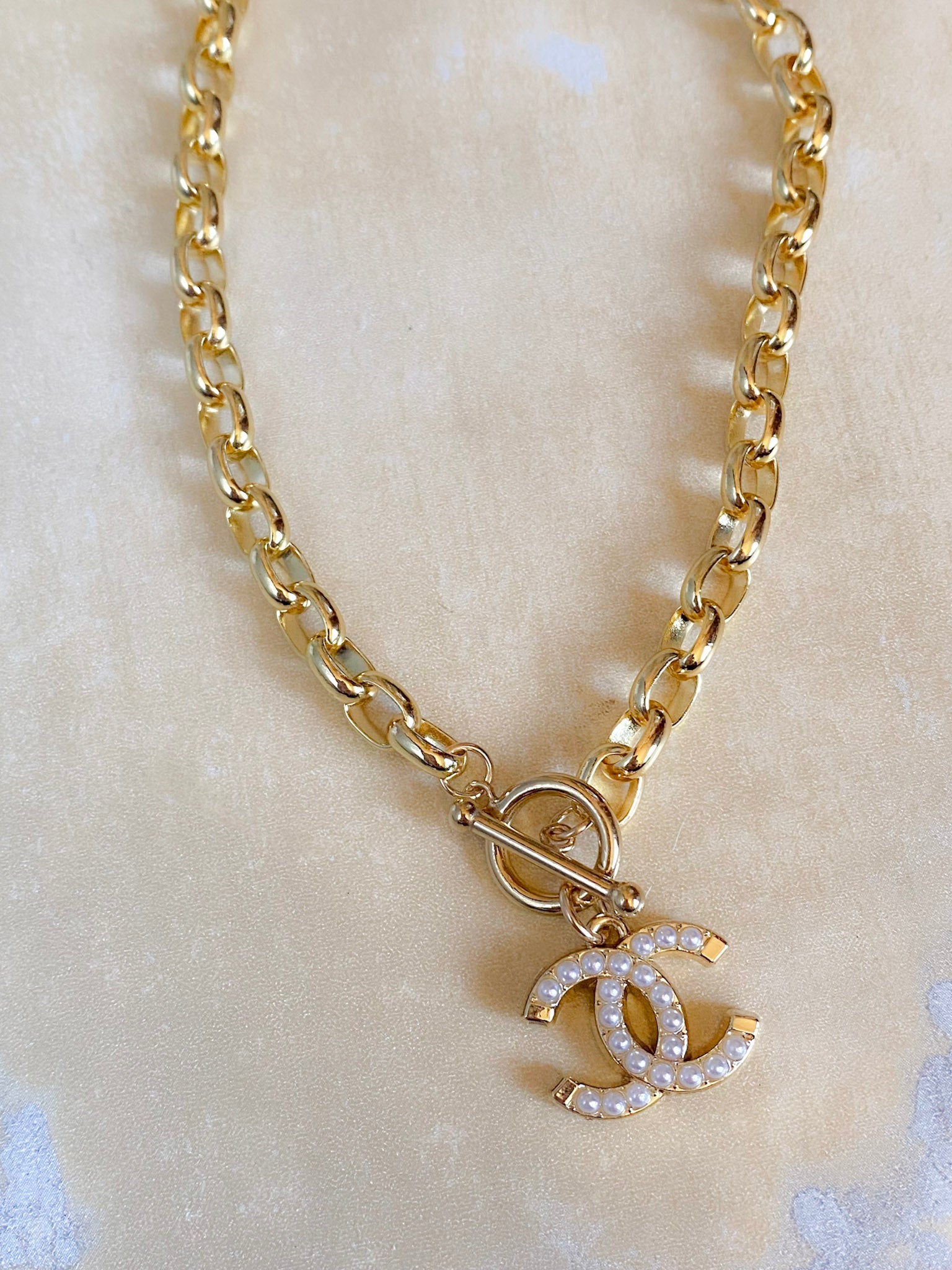 Authentic CC pendant the size of a half dollar on 18 karat GF paper clip chain, 18” or 16” and you may also order it with a half pearl, half paper clip chain, see chain in second picture