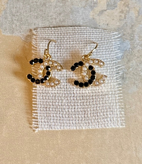 Authentic Chanel repurposed zipper pulls made into dangly earrings, ear wire 18kt gold fill and real pearls, matcha extra long CC BLACK AND WHITE NECKLACE