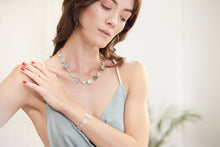A section necklace of bezel-set milky moonstone stones, labradorite, and aquamarine stones. Organically sliced and formatted into a necklace in 14k gold-filled.