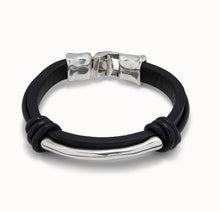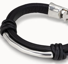 Black leather man's bracelet with two knots and a silver-plated metal tube in the center. Hook fastening. Handmade in Spain by UNOde50. Gender neutral style.