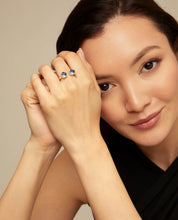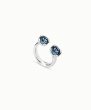 Sterling silver-plated ring with open design and two cases at its ends with two blue faceted crystals facing each other inside. Jewel 100% handmade in Spain.