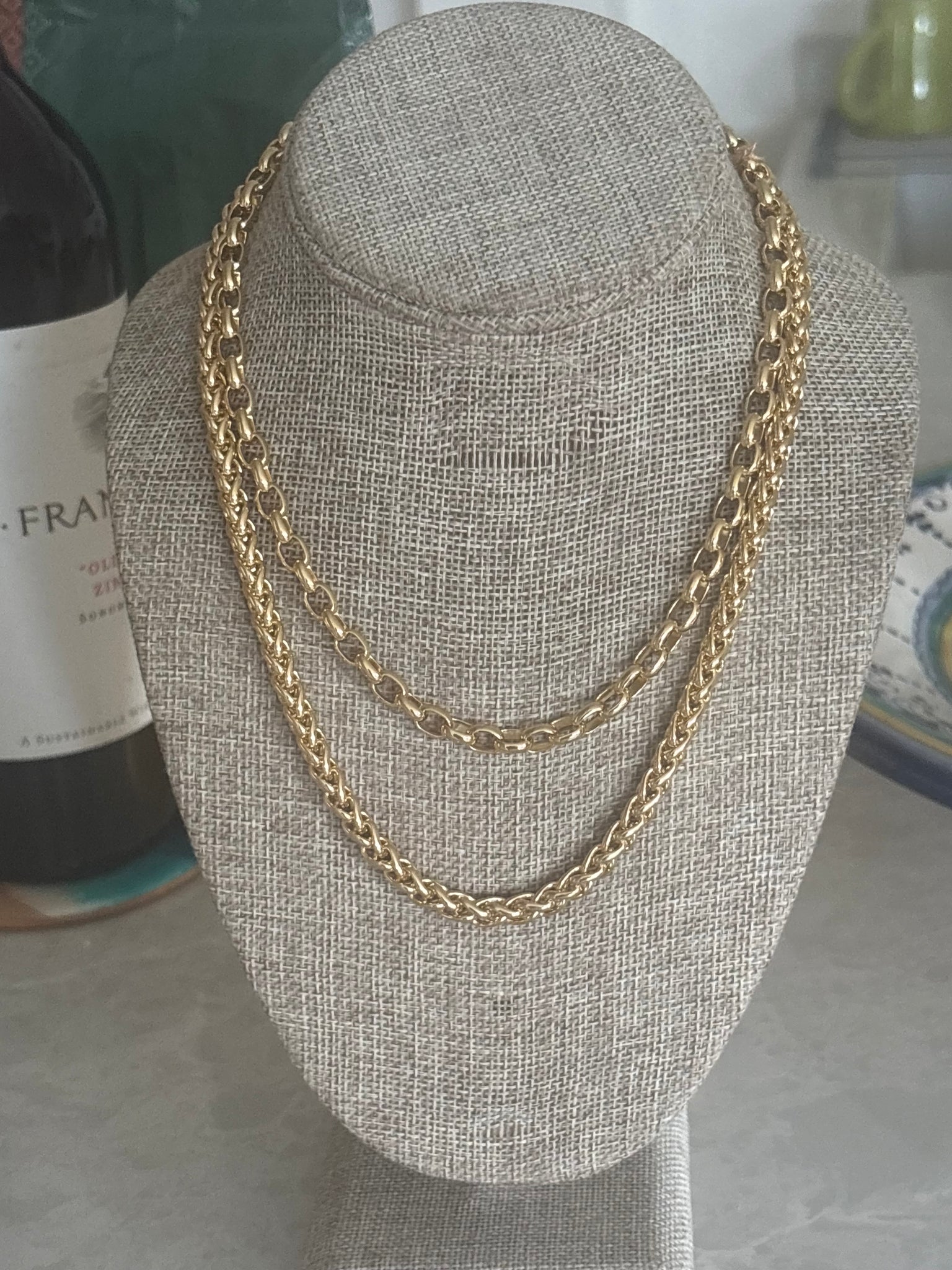 6mm wheat chain in 18kt gold fill you can choose between a 16 inch or 18 inch or 20 inch or you can write to me to customize. Shown here layered with a Rolo and a Cc necklace, but chunky enough to wear on its own as well