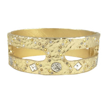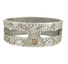 24k gold plated or sterling silver plated bangle with multicolored Swarovski crystals. Spring hinge for easy wear. A stunning piece on its own or stacked with other pieces.