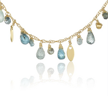 Gorgeous mixed green & blue sapphire teardrops and beads dangling from a gold-filled chain with gold-plated oval findings.