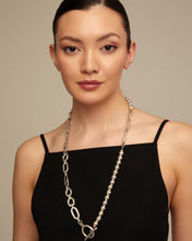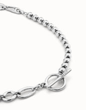 This spectacular silver-plated or gold-plated metal midi necklace consists of multiple beads that culminate in a beautiful closure formed by a circle with UNOde50's engraved logo and a bar. Handcrafted in Spain using 100% artisanal methods.