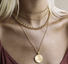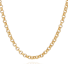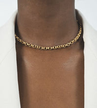 The classic rolo chain, handmade with bold gold rings—a collection must-have. This collar necklace is 17” and can be adjusted to be worn shorter; intended to gently hug the neckline.