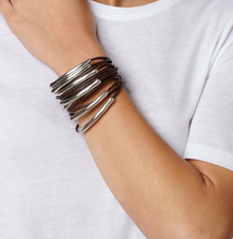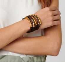 Bracelet of many dark brown leather straps, each with a gold plated tube. A creative bracelet handmade in Spain by UNOde50.