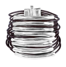 Bracelet of many dark brown leather straps, each with a silver plated tube. A creative bracelet handmade in Spain by UNOde50.